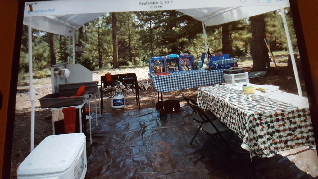 Our sleeping tent is usually set up close by and we can string a tarp above like a breeze way from sleeping tent to kitchen canopy. This way if it rains it helps keep things dry. We have our potty tent close by to the sleeping tent and use outdoor stake sun lamps to light up the path at night. We also will set up the cooking tripod that we use with the Dutch oven over an open campfire.
