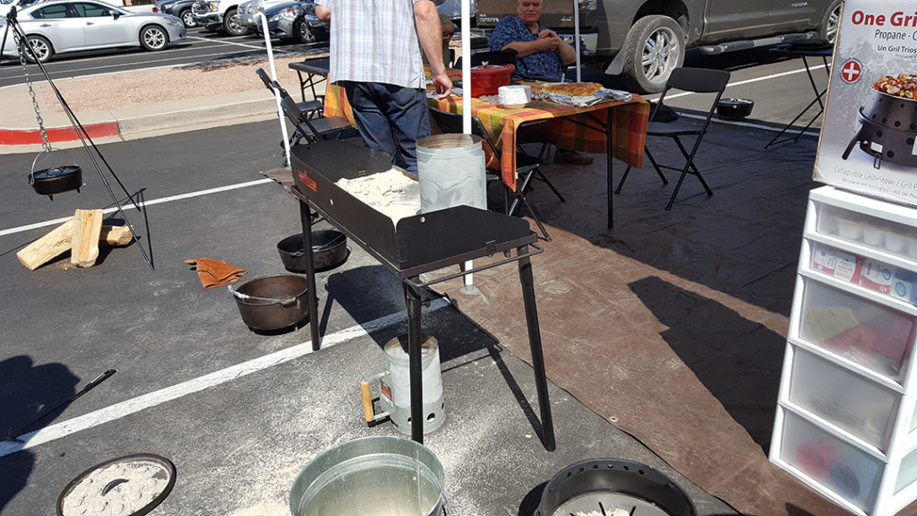 In the middle of the tent we have two folding camp tables end to end with table clothes and chairs. We use black tables and chairs because camping is dirty and black doesn’t show the dirt as much. The camp folding tables and chairs we got from Wal-Mart. The chairs are lightweight, easier for storage. Outside the kitchen we set up our Dutch oven metal table. We use charcoal and have gotten black plastic garbage cans with wheels and twist on lids to put our charcoal in and keep it on the side of the house.