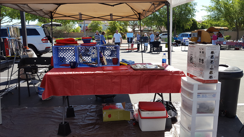 Across from that is the prep table and it is put on plastic 3-4 inch stilts which raises the table to counter height for prepping food. The stilts were bed stilts we bought at Wal-Mart. We have square plastic milk jug holders tipped sideways side by side and at the back of the table to use for storage of canned goods, spices, and other foods. Next to the other end of the table is a plastic 5-drawer storage. In the top drawer is the divided silver ware, the next drawer are the serving utensils such as large spoons, a hand beater, and knives. The cooking spoons and spatulas are metal with rubber handles. When cooking with open flame or Dutch ovens, don’t use plastic spoons and spatulas, they will melt. The next drawer has plastic bags, wrap, and foil. The next drawer has hot pads, hot mitts, and heavy hot glove. The next drawer has lightweight plastic plates, bowls, and cups. We bring paper but if we run out we use the plastic and wash them. We bought them from the dollar store or Fry’s. We have our large cooler close by. A Yeti is the best cooler but pricy.