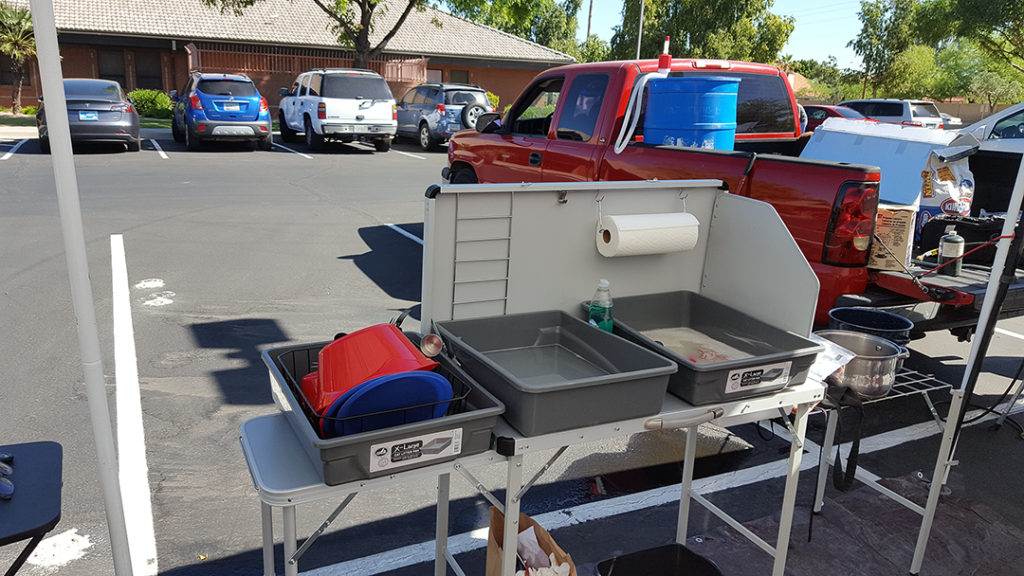 On one side we use the Bass Pro kitchen sink fold out set up and on top we put three large cat litter bins or buss tubs. One is for washing, one for rinsing and one with a drain rack for drying.