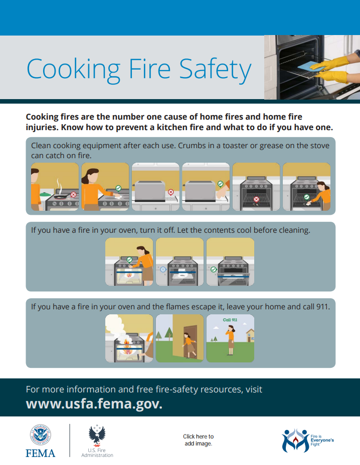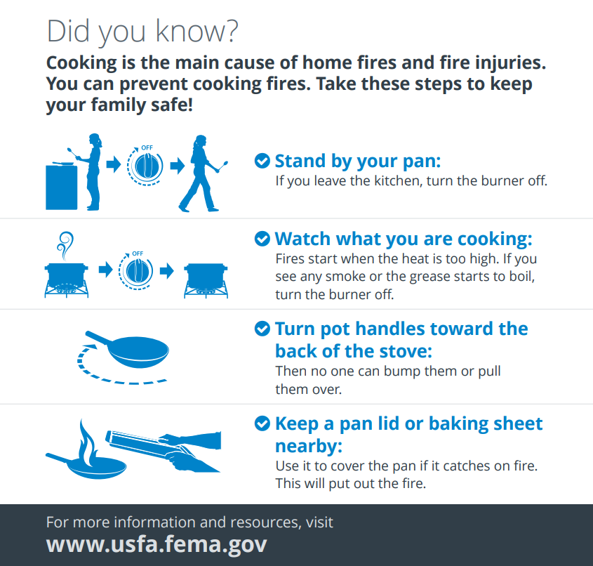 • Kitchen Safety: Never leave cooking unattended, particularly when using stovetops or ovens. Keep flammable items, such as dish towels and paper products, at least three feet away from heat sources.