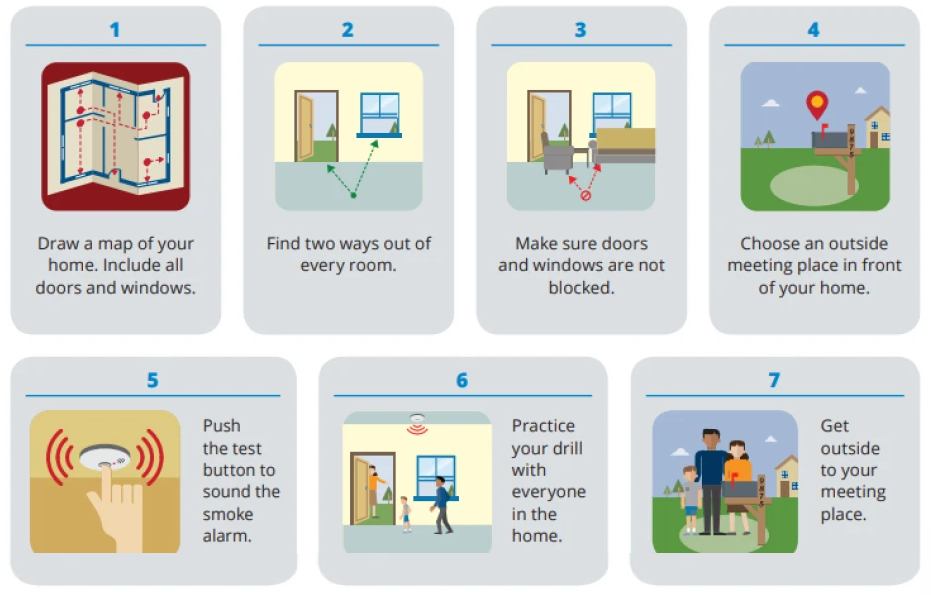 Develop and practice a home fire escape plan. Identify two exit routes from each room, designate an outdoor meeting place, and ensure all household members, including children and vulnerable individuals, understand the plan. Practice drills twice yearly, including at night, to account for disorientation in smoke-filled conditions. Once out, stay out and call emergency services.