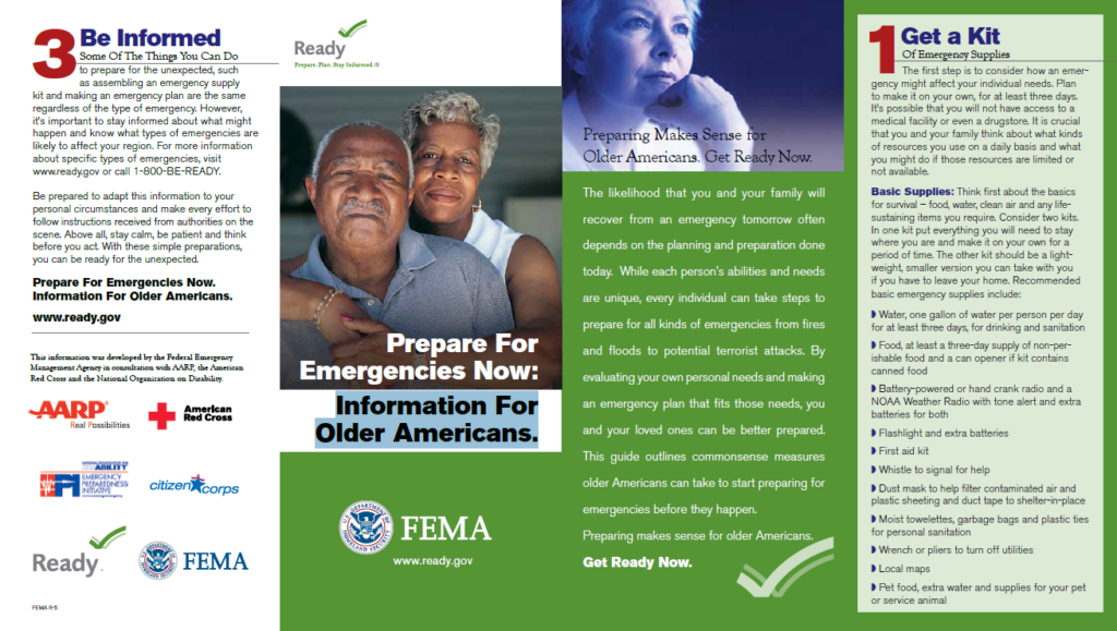 are unique, every individual can take steps to prepare for all kinds of emergencies from fires and floods to potential terrorist attacks. By evaluating your own personal needs and making an emergency plan that fits those needs, you and your loved ones can be better prepared. This guide outlines commonsense measures older Americans can take to start preparing for emergencies before they happen. Preparing also makes sense for older Americans.